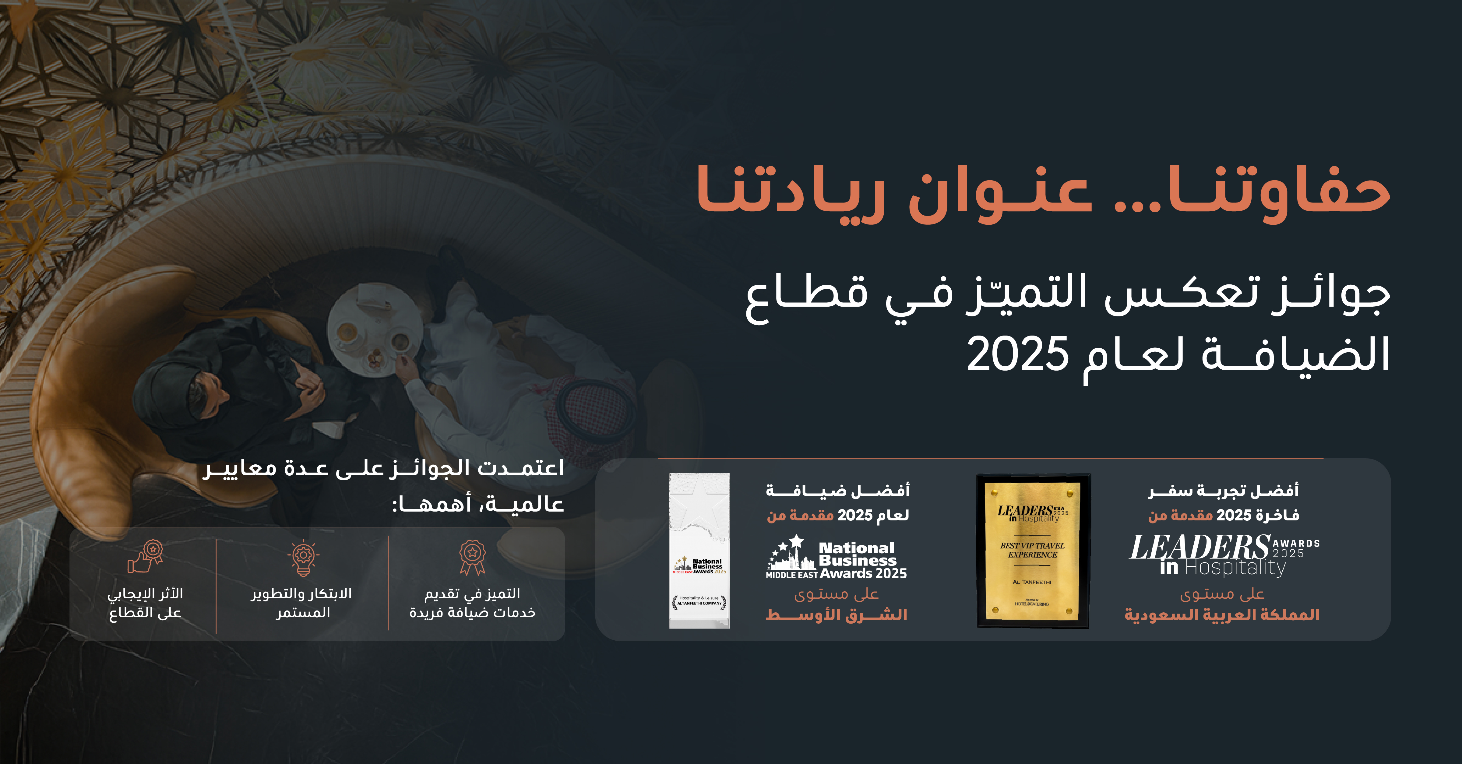 حصدت شركة "التنفيذي" جائزة (أفضل تجربة سفر فاخرة) على مستوى المملكة من Leaders in Hospitality Awards KSA 2025، وجائزة (National Business Award – Hospitality & Leisure) على مستوى الشرق الأوسط، وذلك تقديراً لريادتها في تطوير تجارب سفر استثنائية وتعزيز معايير الضيافة الفاخرة محلياً وإقليمياً.